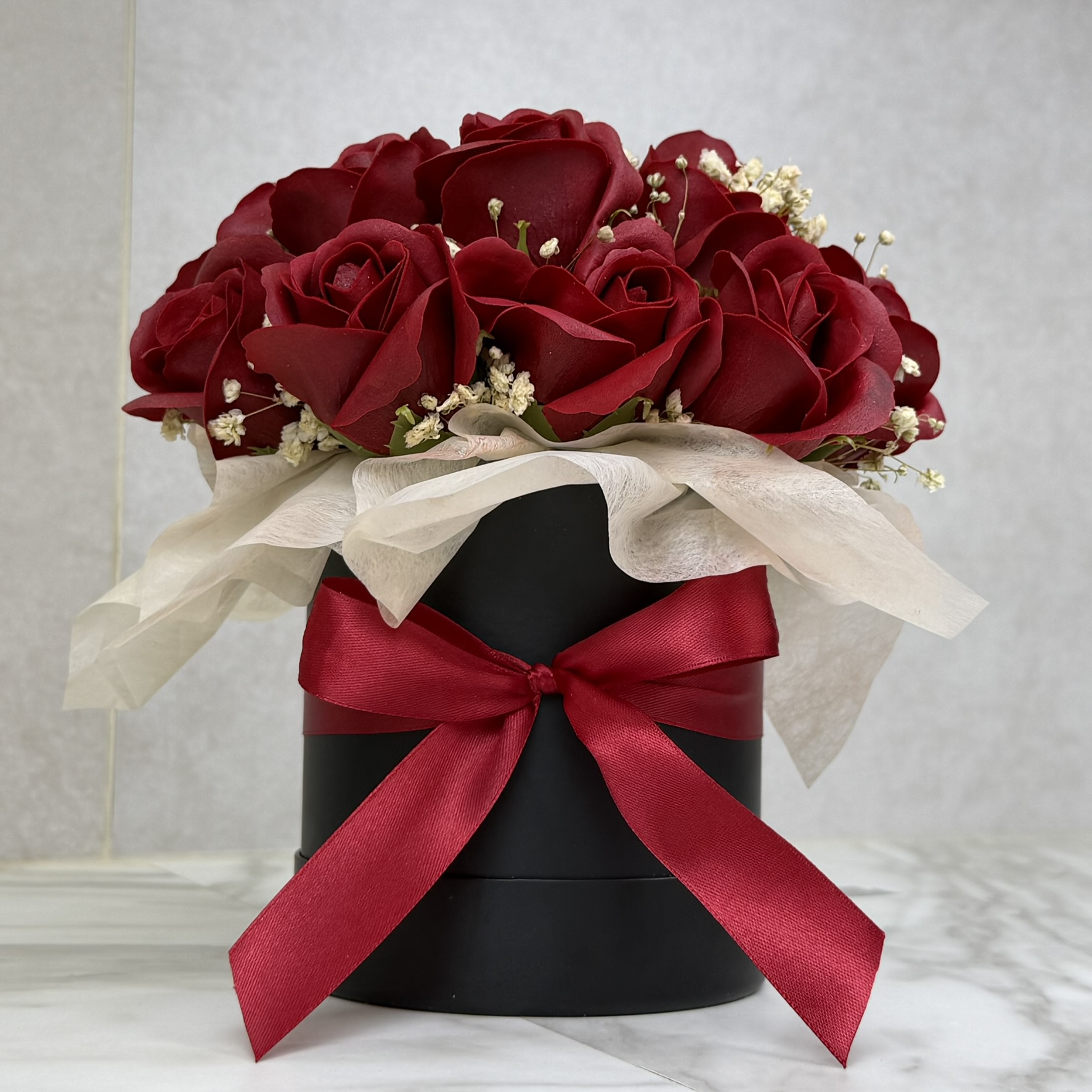 Starannie ułożone róże mydlane zachwycają dopracowanym wyglądem i trwałością — nie więdną i nie wymagają pielęgnacji, dzięki czemu flowerbox pozostaje piękną pamiątką na długi czas. Satynowa wstążka subtelnie dopełnia kompozycję, podkreślając jej elegancki styl.